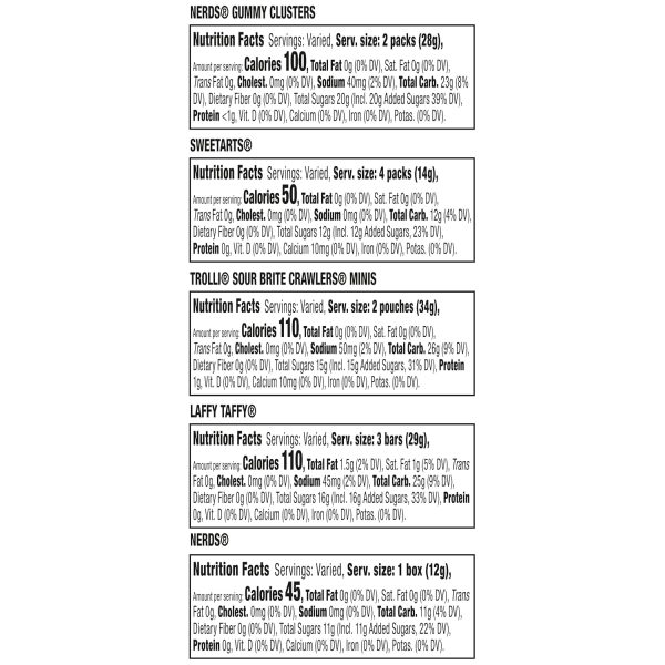 - GRAB-AND-GO. SHAREABLE TREATS: 100 individually wrapped candy pieces including Nerds Gummy Clusters. Nerds Candy Original Strawberry and Grape. Trolli Sour Brite Crawler Minis. SweeTARTS Original. and Laffy Taffy Candy with Jokes on Every Wrapper.