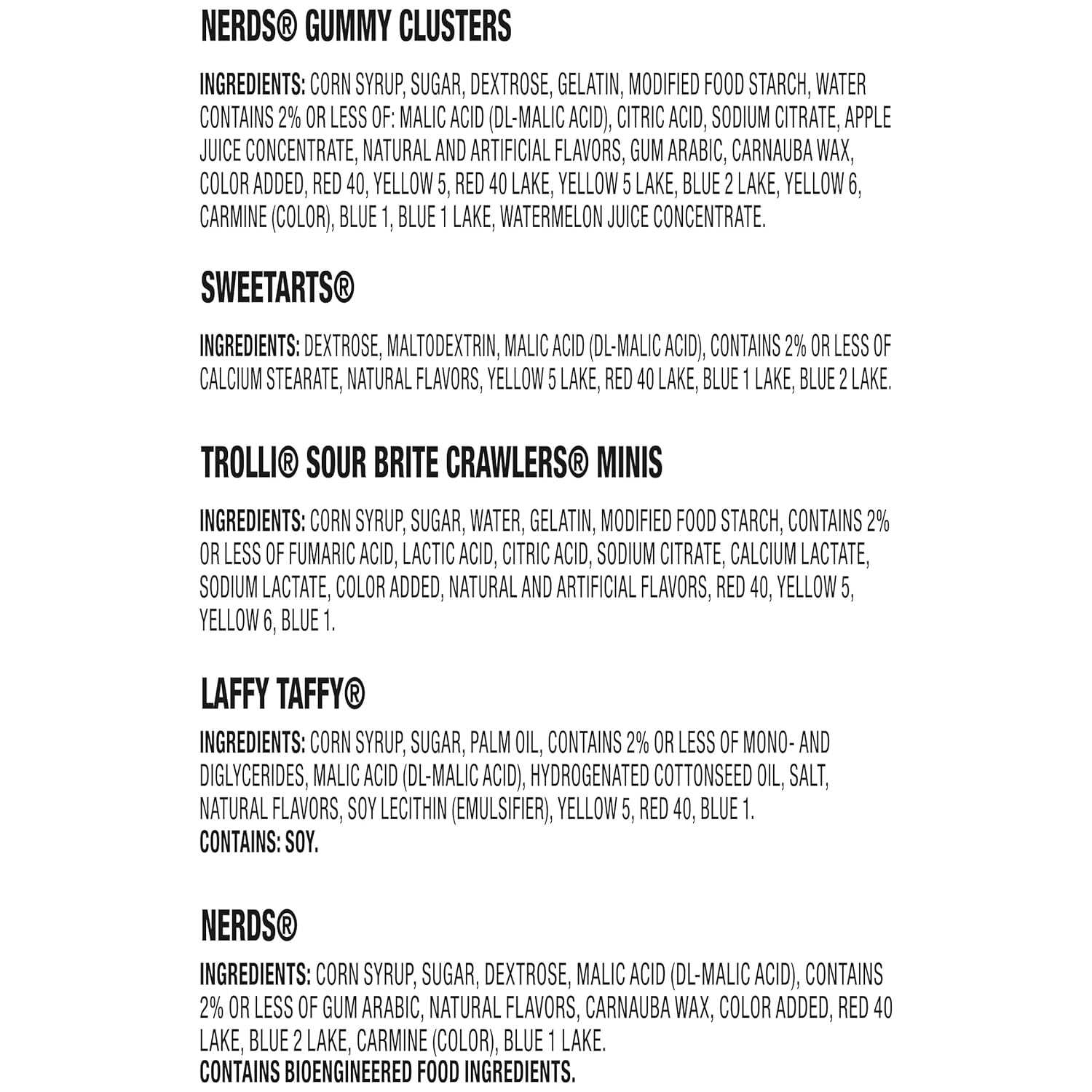 - GRAB-AND-GO. SHAREABLE TREATS: 100 individually wrapped candy pieces including Nerds Gummy Clusters. Nerds Candy Original Strawberry and Grape. Trolli Sour Brite Crawler Minis. SweeTARTS Original. and Laffy Taffy Candy with Jokes on Every Wrapper.
