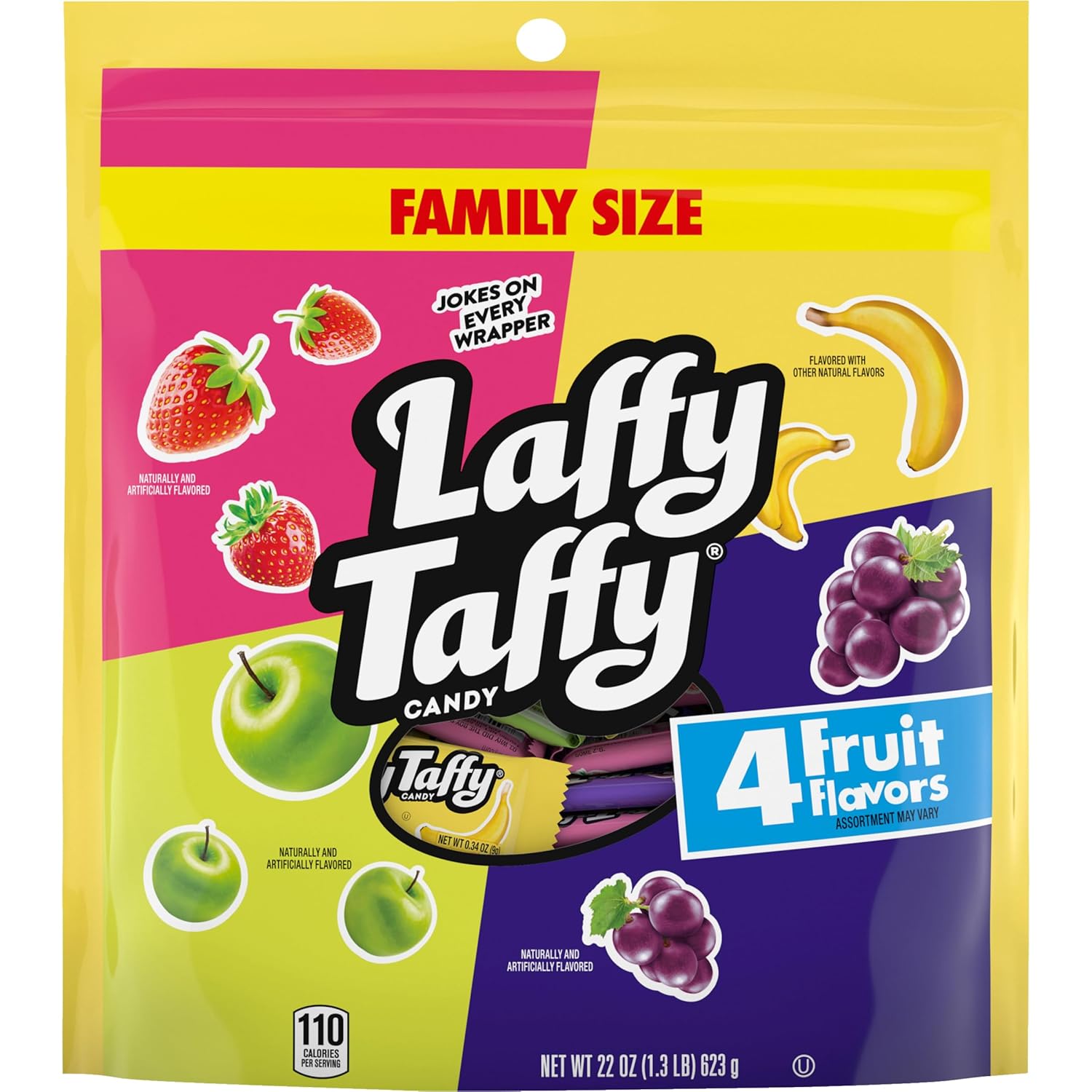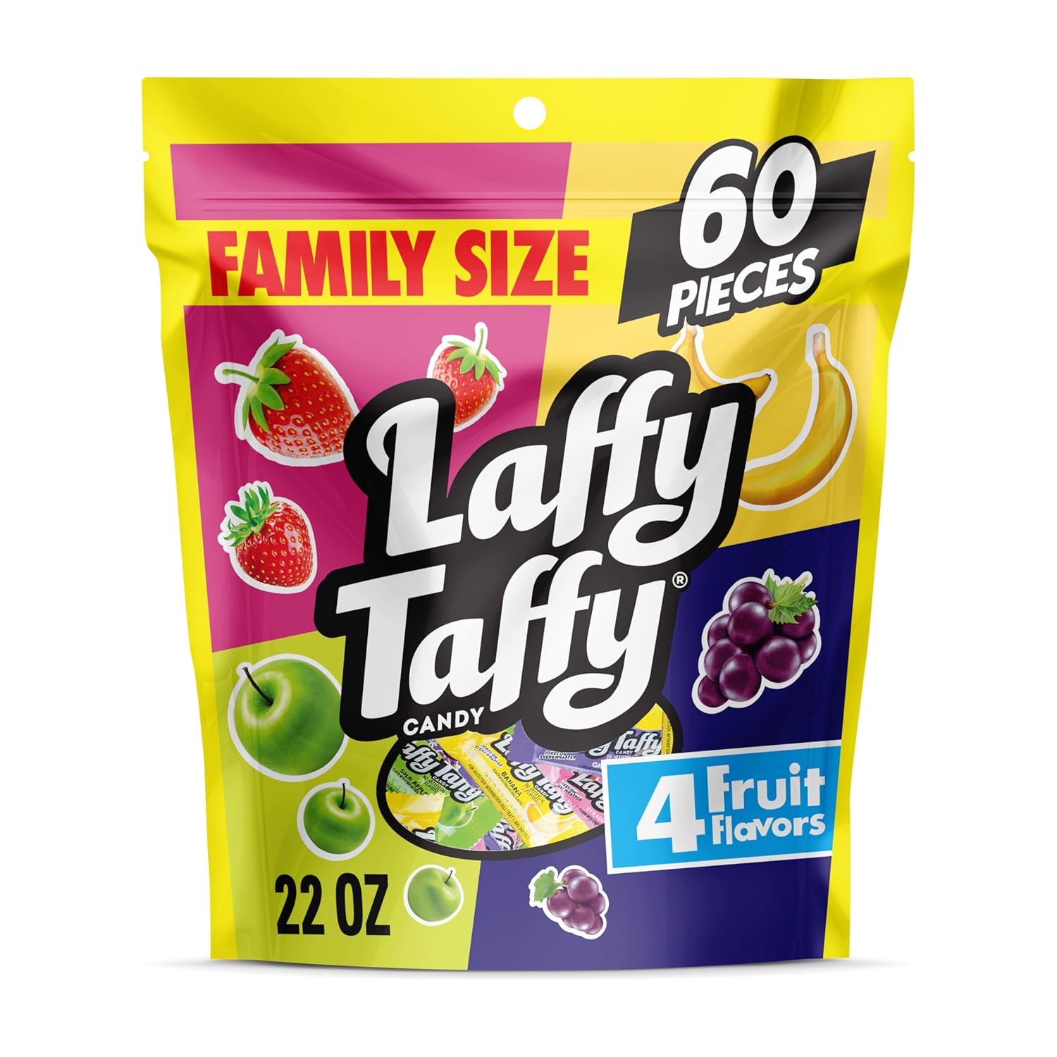 - FRUITY VARIETY: Laffy Taffy Assorted Mini Bars (22oz) turn each bite into delight with a long-lasting fruity flavor made to savor. This pack includes strawberry. banana. sour apple and grape flavors
